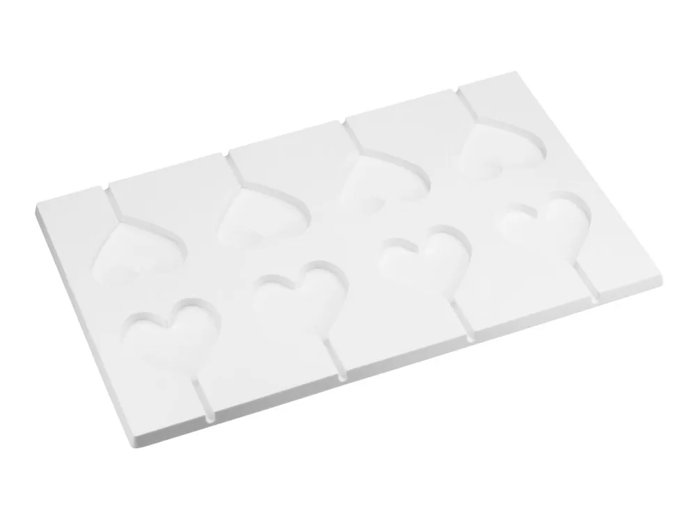 Heart Lolli Flex Mold – lanksti silikoninė, kurios pagalba vienu kartu pagaminsite 8 širdies formos ledinukus ar saldainius ant pagaliuko (ar be jo) iš įvairiausių medžiagų, tokių kaip šokoladas, karamelė, izomaltas, glajus ir daugelio kitų. Forma yra nelipniu paviršiumi, todėl skanėstus išimsite lengvai, o taip pat patogiai galėsite naudoti pakartotinai.